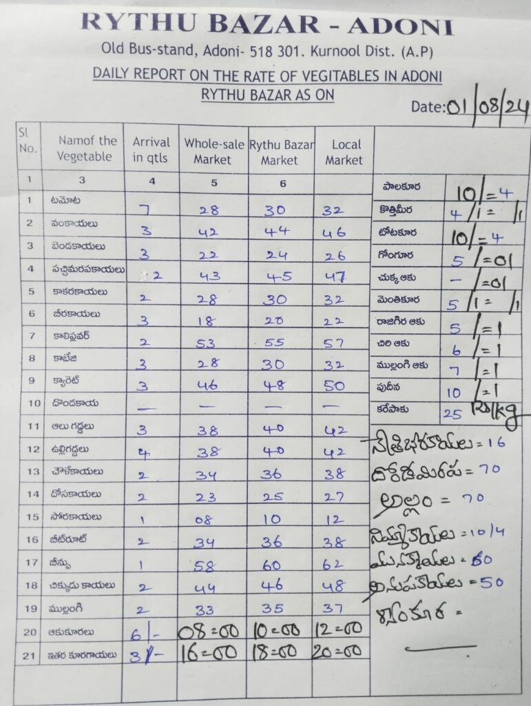 ఆదోని రైతు బజార్లో హోల్సేల్ మరియు రిటైల్ ధరలు