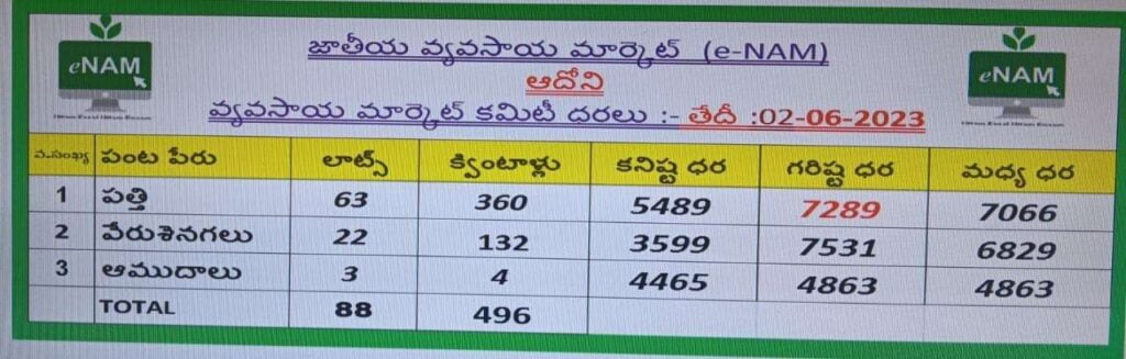 ఆదోని జాతీయ వ్యవసాయ మార్కెట్ కమిటీ ధరలు (02 06 2023)
