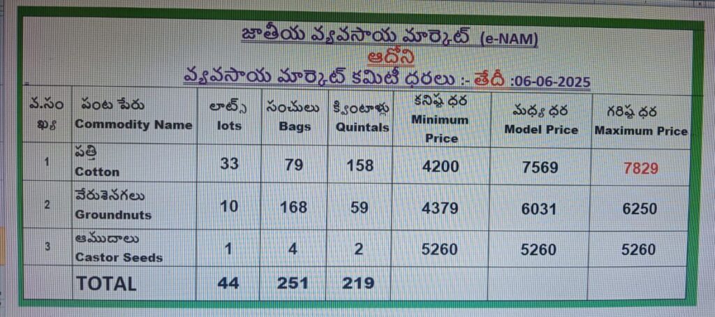 తేదీ 06-06-25 కర్నూలు జిల్లా ఆదోని వ్యవసాయ మార్కెట్లో పత్తి,వేరుశనగ, ఆముదాలు ఎండు మిర్చి ధరలు ఈ విధంగా ఉన్నాయి.