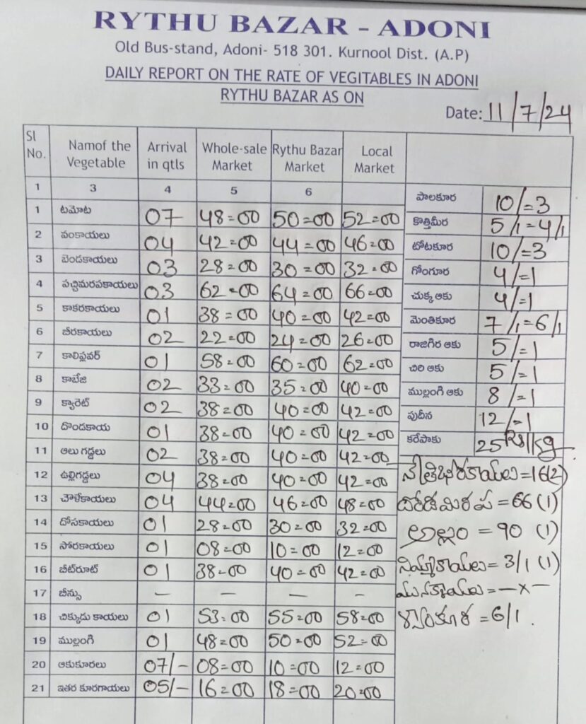 ఆదోని రైతు బజార్లో ఈరోజు కూరగాయలను ఈ విధంగా ఉన్నాయి 11.07.2024