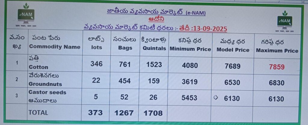 తేదీ 13-09-25 కర్నూలు జిల్లా ఆదోని వ్యవసాయ మార్కెట్లో పత్తి, వేరుశనగ, ఆముదాలు ఎండు మిర్చి ధరలు ఈ విధంగా ఉన్నాయి.