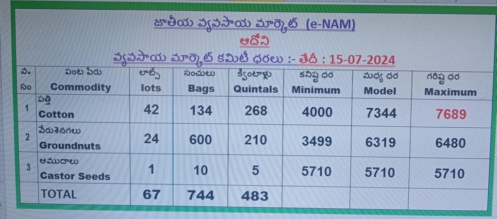 కర్నూలు జిల్లా ఆదోని వ్యవసాయ మార్కెట్లో పత్తి, వేరుశనగ, ఆముదాల ధరలు ఈ విధంగా ఉన్నాయి. తేదీ 15-07-24