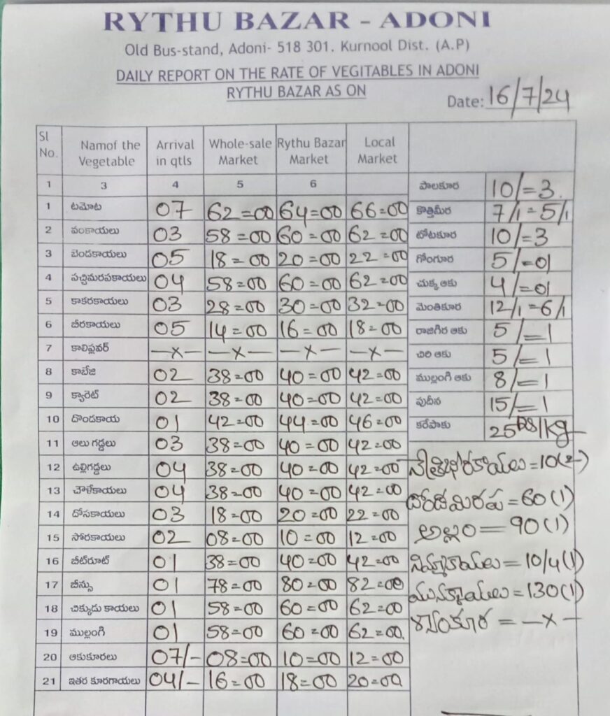 ఆదోని రైతు బజార్లో ఈరోజు కూరగాయలను ఈ విధంగా ఉన్నాయి 16.07.2024