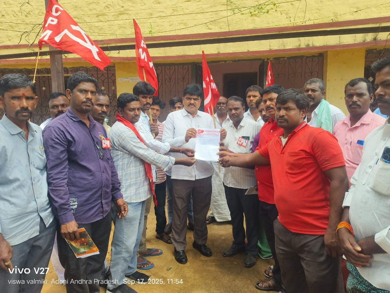 కర్నూలు జిల్లా ఆదోని మండలంలో త్రాగునీరు, రోడ్లు, స్మశాన వాటిక సమస్యలు మరియు మౌలిక సదుపాయాలు కల్పించాలని కోరుతూ ఎంపీడీవో కార్యాలయం ముందు CPM పార్టీ ఆధ్వర్యంలో మండల కార్యవర్గ సభ్యులు ఉచ్చిరప్ప అధ్యక్షతన ధర్నా నిర్వహించారు. అనంతరం సమస్యలతో కూడిన వినతిపత్రాన్ని ఎంపీడీవో జనార్ధన్ కు వినతి పత్రం అందజేశారు. అనంతరం సిపిఎం పార్టీ మండల కార్యదర్శి కే. లింగన్న, కార్యదర్శి వర్గ సభ్యులు బి. వీరారెడ్డి మాట్లాడుతూ