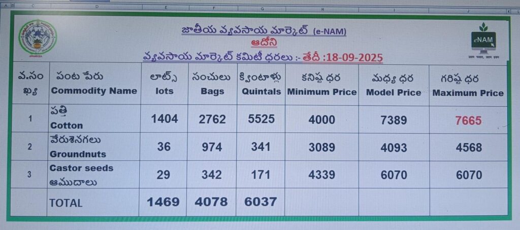 తేదీ 18-09-25 కర్నూలు జిల్లా ఆదోని వ్యవసాయ మార్కెట్లో పత్తి,వేరుశనగ, ఆముదాలు ఎండు మిర్చి ధరలు ఈ విధంగా ఉన్నాయి.