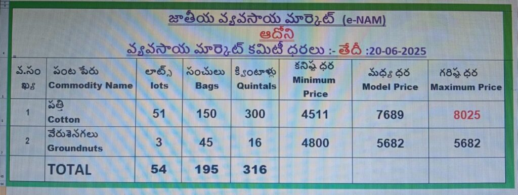 తేదీ 20-06-25 కర్నూలు జిల్లా ఆదోని వ్యవసాయ మార్కెట్లో పత్తి,వేరుశనగ, ఆముదాలు ఎండు మిర్చి ధరలు ఈ విధంగా ఉన్నాయి.