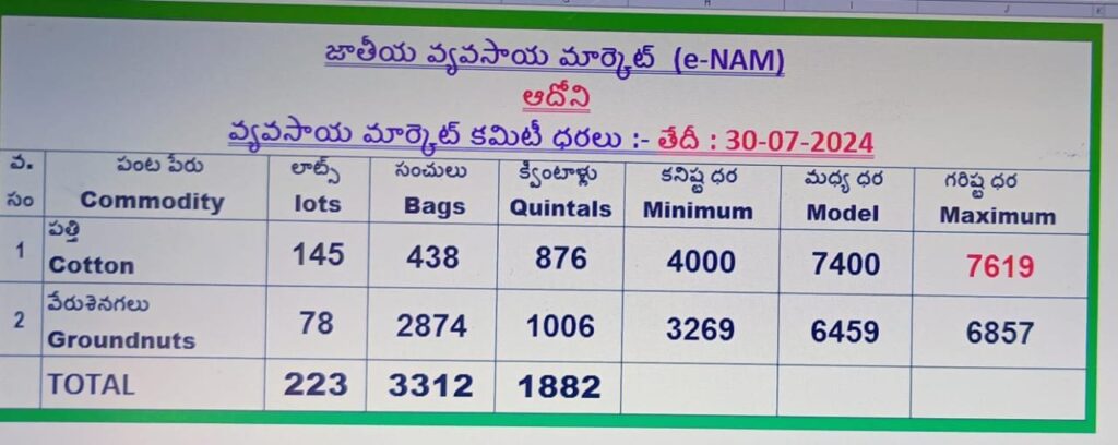 కర్నూలు జిల్లా ఆదోని వ్యవసాయ మార్కెట్లో పత్తి, వేరుశనగ, ఆముదాల ధరలు ఈ విధంగా ఉన్నాయి. తేదీ 30-07-24