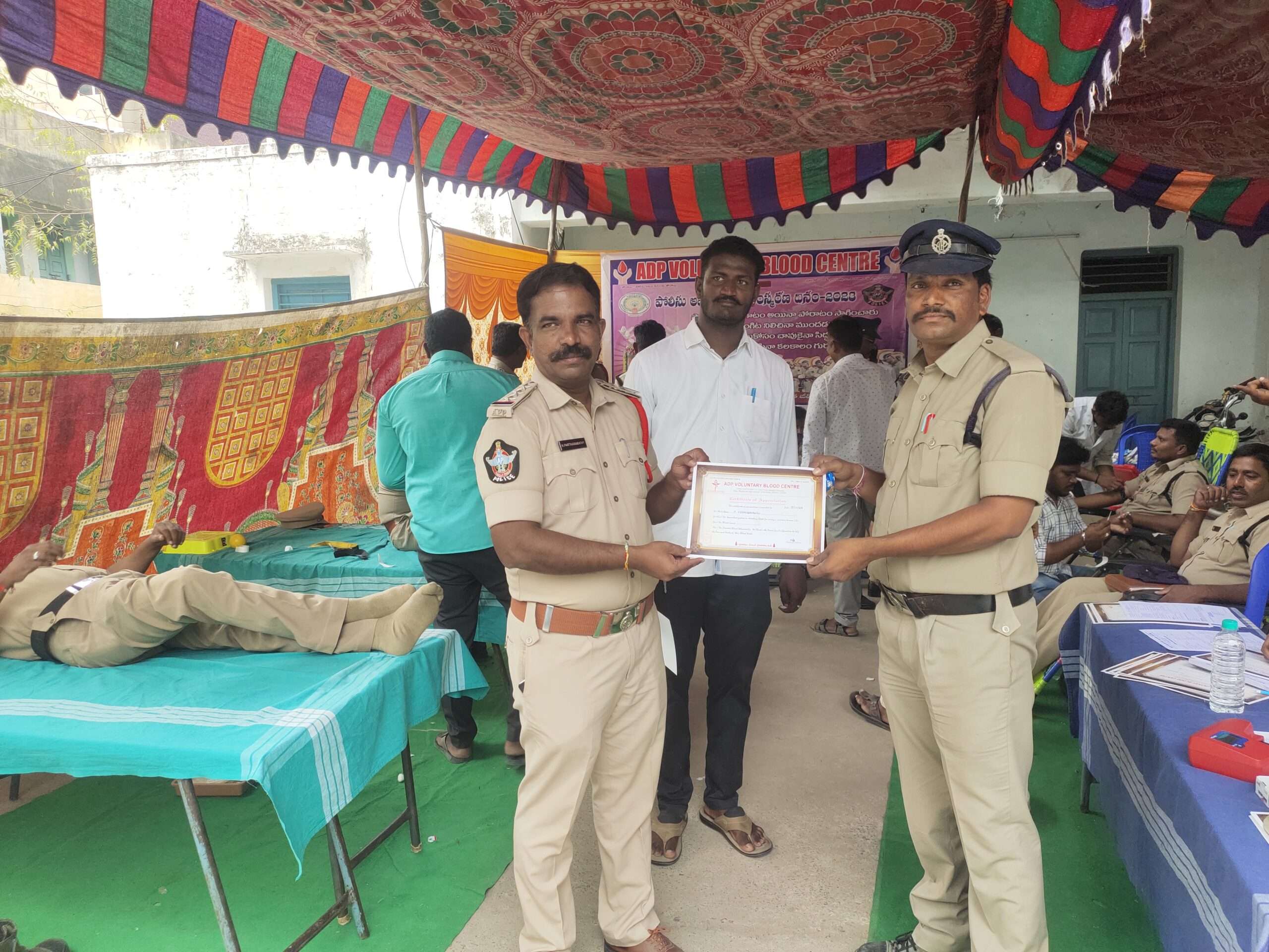 కర్నూలు జిల్లా ఆదోని లో పోలీసుల అమరవీరుల సంస్కరణ దినోత్సవం సందర్భంగా ఆంజనేయ స్వామి దేవాలయం ఆవరణంలో రక్తదాన శిబిరం ఏర్పాటు చేసి రక్తదానం చేసిన డి.ఎస్.పి శివ నారాయణ స్వామి, సిఐలు, ఎస్సైలు, పోలీసులు.