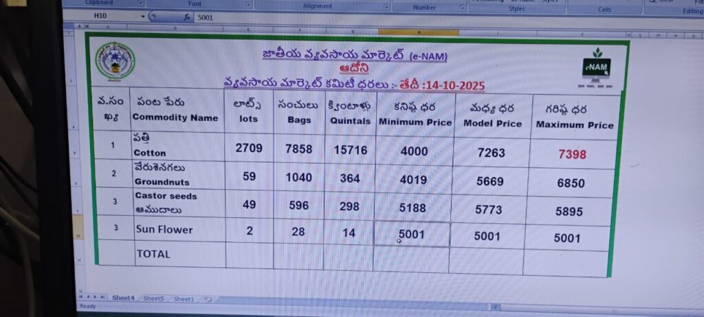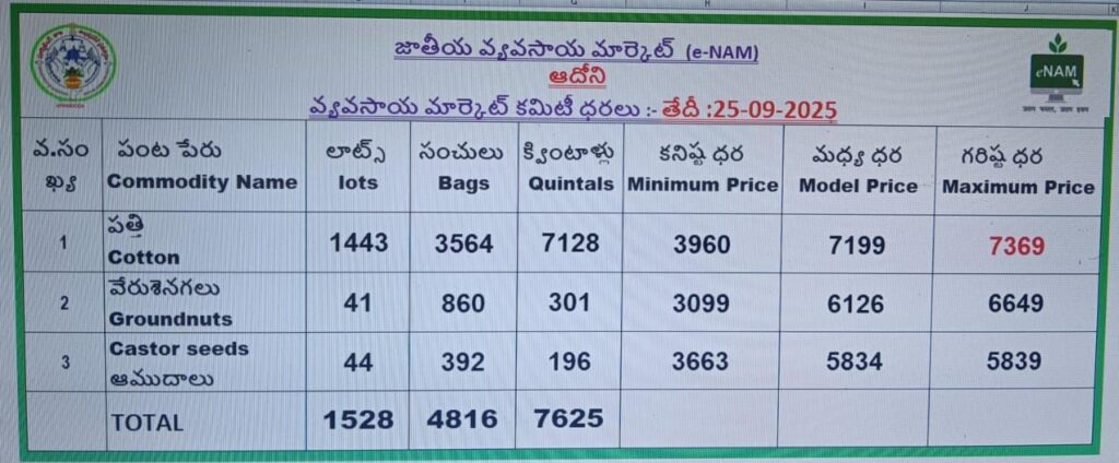 కర్నూలు జిల్లా ఆదోని జాతీయ వ్యవసాయ మార్కెట్‌ (e-NAM)లోని తాజా మార్కెట్‌ ధరల వెల్లడి ప్రకారం, 14-10-2025 తేదీన వివిధ వాణిజ్య పంటలకు నమోదైన ధరలు ఇలా ఉన్నాయి